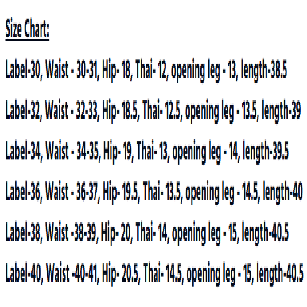 Label-40, Waist -40-41, Hip- 20.5, Thai- 14.5, opening leg - 15, length-40.5